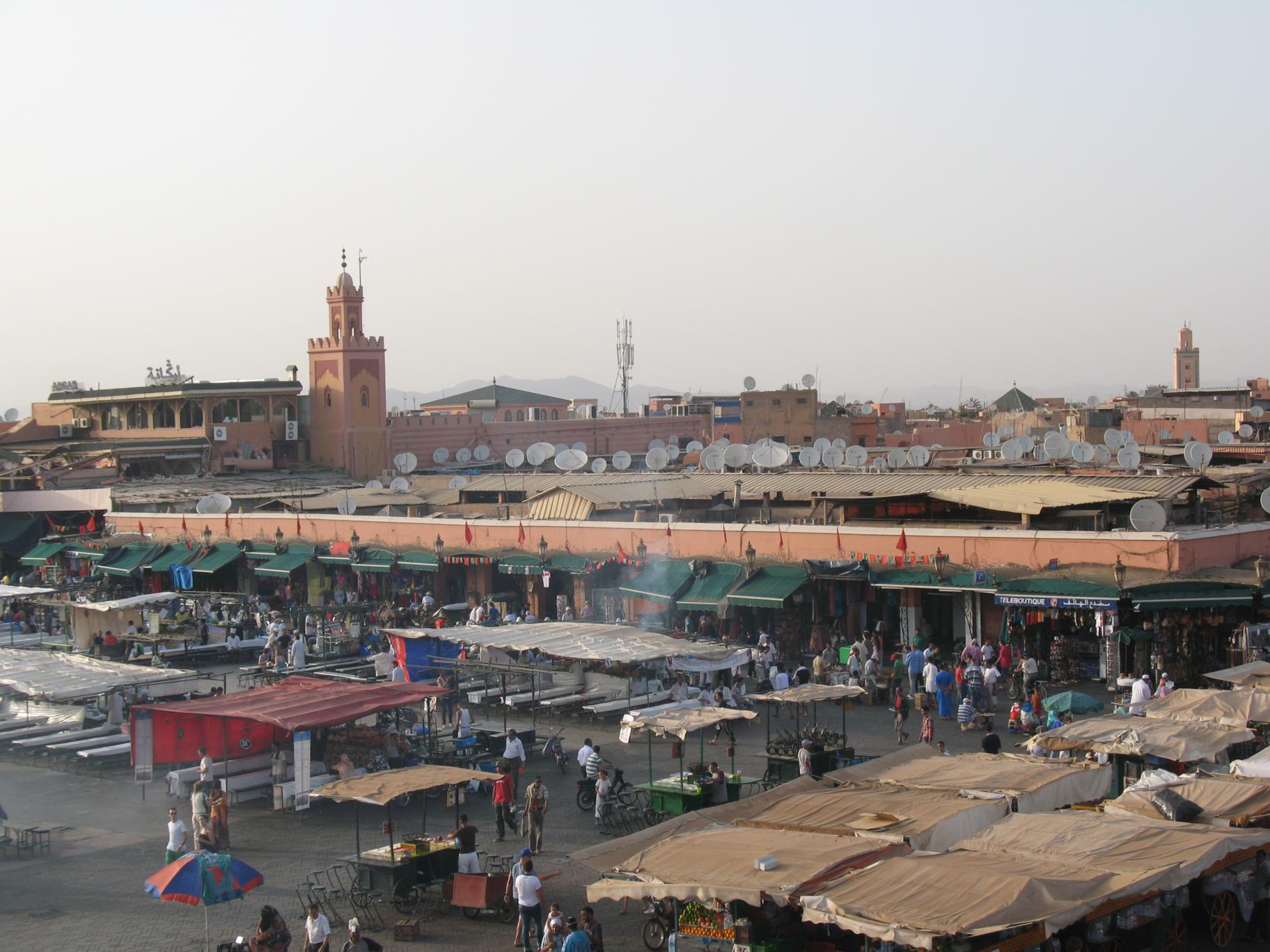 Salida de la ciudad de origen a la hora prevista con destino al aeropuerto de Madrid-Barajas. Llegada y de pronto te encuentras en un lugar fuera del tiempo. Empezarmos por la plaza Jemaa el-fna. Por la mañana, vendedores de zumo de naranjas natural, de frutas, cestos de mimbre, recuerdos, dulces, bisutería, dentistas, curanderos, escritores por encargo. A veces también desde la mañana y hasta la noche: los Gnaoua, tocadores de crótalos, acróbatas, encantadores de serpientes o de escorpiones, bailarines, contadores de cuentos. Este universo se vuelve particularmente fascinante con la caída de la tarde, cuando la plaza se ilumina con mil y una luces y se deambula de espectáculo en espectáculo. Alojamiento en hotel.